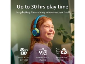 Philips TAK4200 djecije slušalice; Bežične sluš. koje se stavljaju na uši; Glasnoća ograničena na 85 dB; LED svjetla. Dijeljenje zvuka; Izdržljive i preklopive; Aplikacija za slušalice tvrtke Philips s roditeljskim nadzorom; do 45 sati reprodukcije;