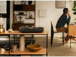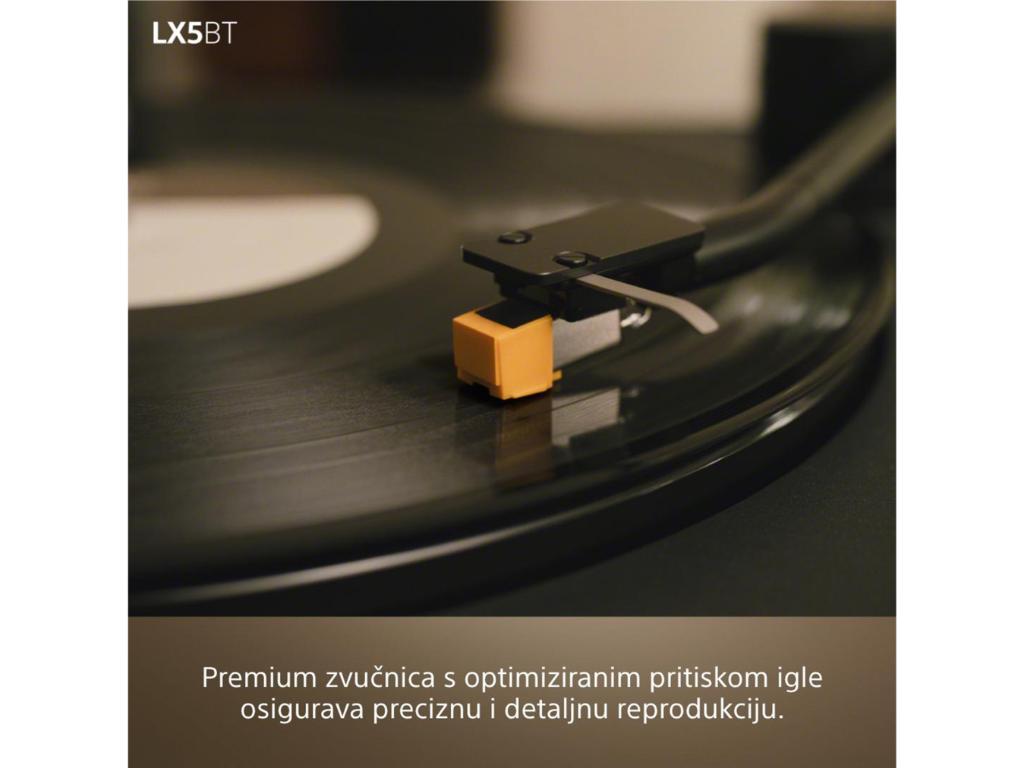 Sony Gramofon PSLX5BT; automatsko pokretanje gramofona remenastim pogonom s dvije brzine: 33-1/3, 45 ok./min.; Bluetooth povezivanje uz tehnologije aptX Adaptive i Hi-Res Wireless Audio; zvuk visoke kvalitete
